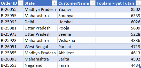 select Top 10 L.[Order ID],L.State,L.CustomerName,sum(D.Amount) ‘Toplam Fiyat Tutarı’