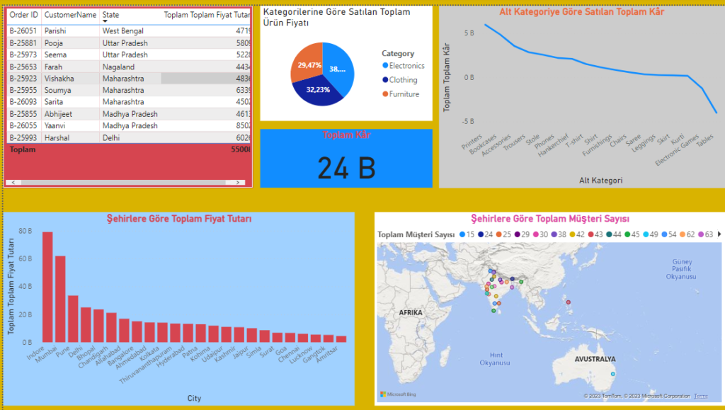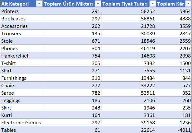 select [Sub-Category] As ‘Alt Kategori’,sum(Quantity)’Toplam Ürün Miktarı’,sum(Amount) ‘Toplam Fiyat Tutarı’, sum(Profit) As ‘Toplam Kâr’