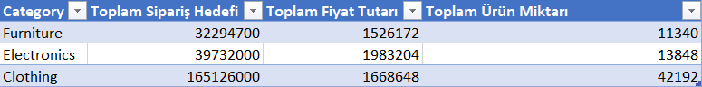 —-Kategorilerine göre Toplam Sipariş Hedefi, Toplam Fiyat Tutarı ve Toplam Ürün Miktarlarını karşılaştıralım