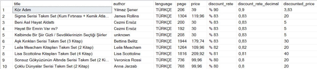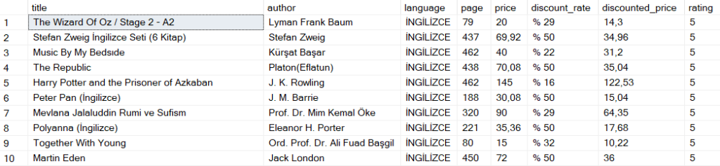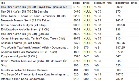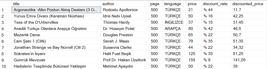 1-Kitapların ismi, sayfası, fiyatı, indirim oranı ve indirimli fiyatlarını gösteren sorgu (indirimli fiyatlarına göre pahalıdan ucuza sırala)