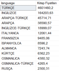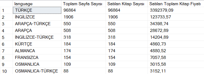 17-Dillere göre toplam sayfa sayıları, satılan kitap sayıları ve satılan toplam kitap fiyatı