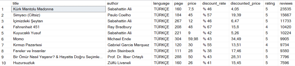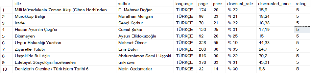 select title,author,language,page,price,discount_rate,discounted_price,rating,reviews
