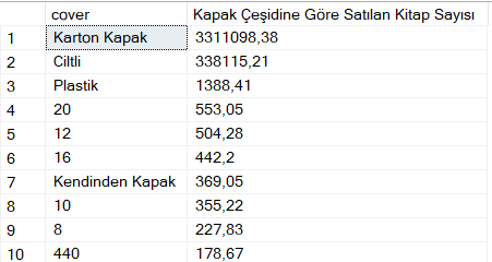 select cover,sum(discounted_price) as 'Kapak Çeşidine Göre Satılan Kitap Sayısı'