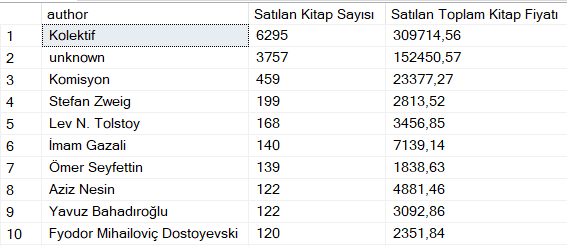 14-En çok kitabı satılan ilk 50 yazarı listele